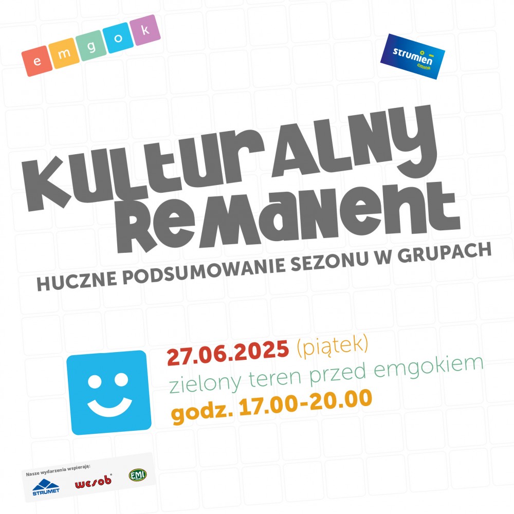 Miejsko-Gminny Ośrodek Kultury w Strumieniu serdecznie zaprasza na KULTURALNY REMANENT, czyli huczne podsumowanie sezonu w grupach i zespołach działających w ramach zajęć popołudniowych emgoku! Wydarzenie odbędzie się w piątek 27 czerwca 2025 o godzinie 17:00 na zielonym terenie przy emgoku (ul. Młyńska 14). Zabierzcie ze sobą sprzęt piknikowy: koce, leżaczki, itp. Do zobaczenia!