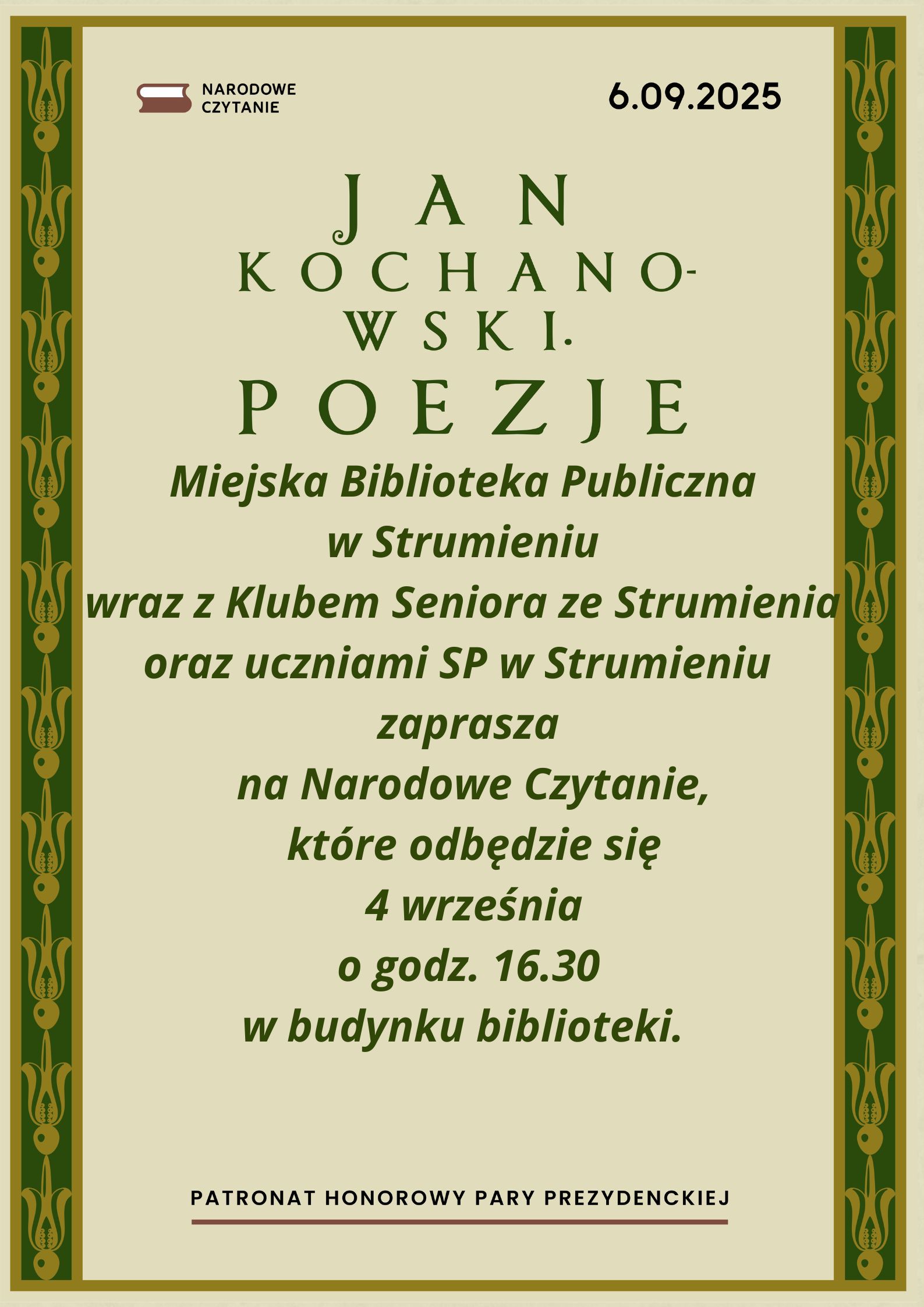 zaprasza na Narodowe Czytanie, które odbędzie się 4 września o godz. 16:30 w budynku biblioteki.