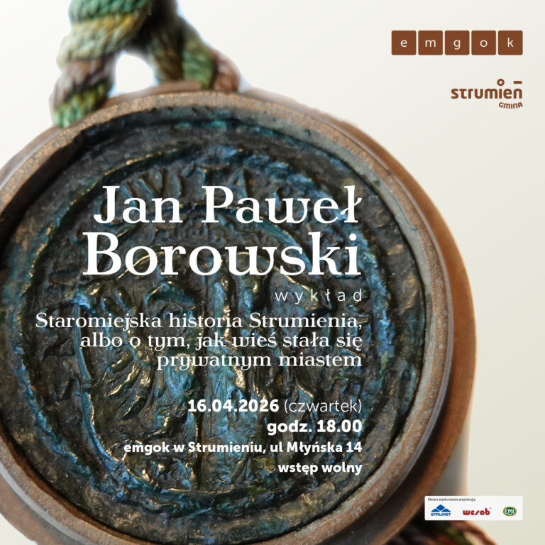 Miejsko-Gminny Ośrodek Kultury w Strumieniu zaprasza miłośników lokalnej historii na wykład Jana Pawła Borowskiego pt. „Staromiejska historia Strumienia, czyli o tym, jak wieś stała się prywatnym miastem”. Spotkanie odbędzie się w czwartek, 16 kwietnia 2026 r., o godz. 18:00 w sali widowiskowej strumieńskiego emgoku (ul. Młyńska 14). Wstęp wolny, zapraszamy!