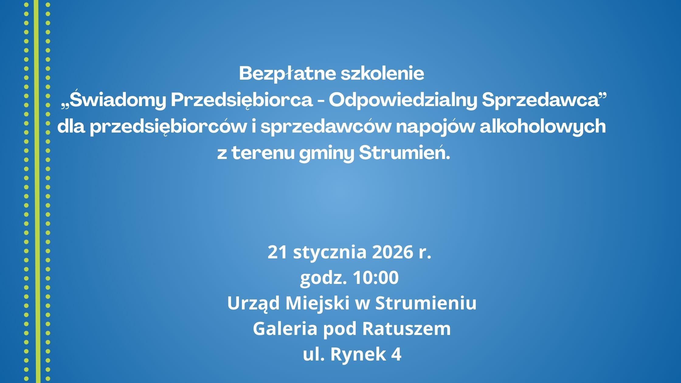 Szkolenie odbędzie się w dniu 21 stycznia 2026 r. o godz. 10:00 w Urzędzie Miejskim w Strumieniu w Galerii pod Ratuszem.