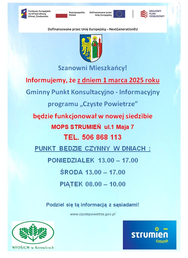 Informujemy, że od dnia 1 marca 2025 roku Gminny Punkt Konsultacyjno-Informacyjny Programu „Czyste Powietrze” będzie funkcjonował w nowej siedzibie - Miejski Ośrodek Pomocy Społecznej w Strumieniu ul. 1 Maja 7.