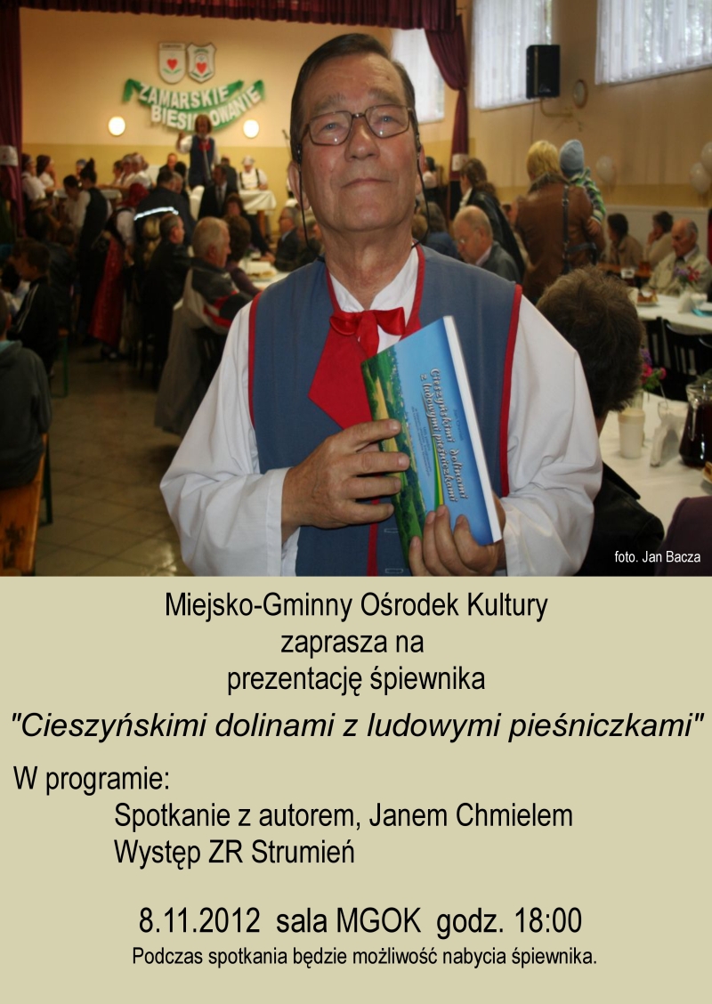165 regionalnych pieśni z okolic Strumienia, Skoczowa i Cieszyna opisał w swojej najnowszej książce znany poeta i popularyzator gwary Jan Chmiel. „Cieszyńskimi dolinami z ludowymi pieśniczkami” to zbiór regionalnych pieśni zapisany w łatwym trzygłosowym układzie na zespół wokalny. Zbiór ten prezentuje dorobek kultury muzycznej Ziemi Cieszyńskiej. Jednak walorem tej pracy nie jest jedynie zebranie i opracowanie tych pieśni. Świadczy o tym chociażby fakt, że poeta potrafił uzupełnić tekst w brakujących strofach, który został zapomniany na przestrzeni lat.