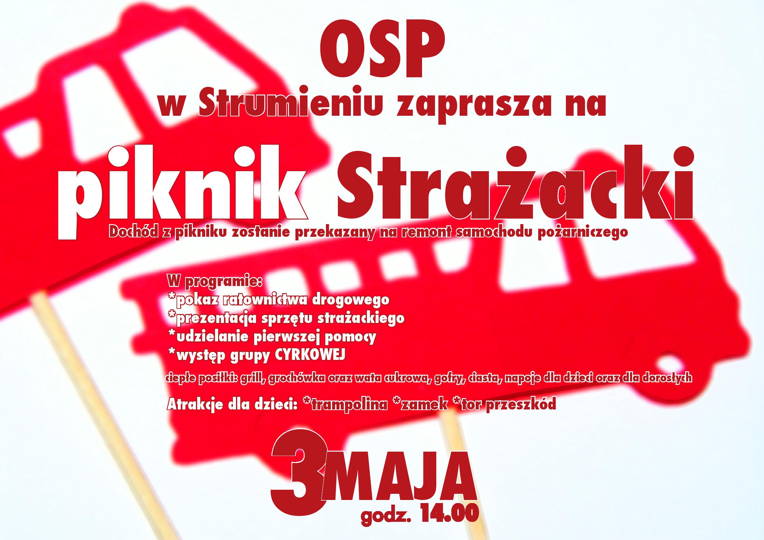 Strażacy ze Strumienia zapraszają na piknik. Impreza rozpocznie się 3 maja o 14:00 na terenie Ochotniczej Straży Pożarnej w Strumieniu.