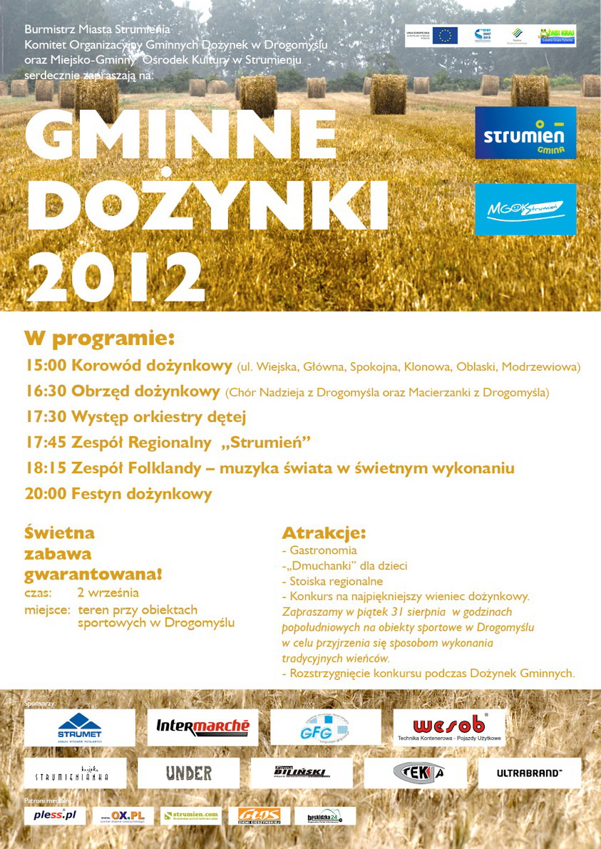 Burmistrz Miasta Strumienia serdecznie zaprasza w imieniu organizatorów: Komitetu Organizacyjnego Gminnych Dożynek w Drogomyślu oraz Miejsko-Gminnego Ośrodka Kultury w Strumieniu na Dożynki Gminne.