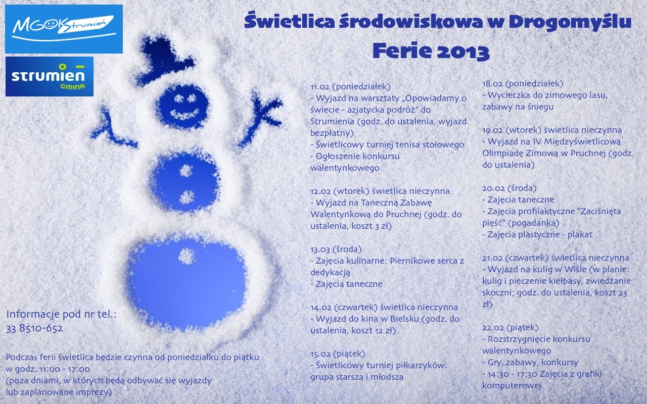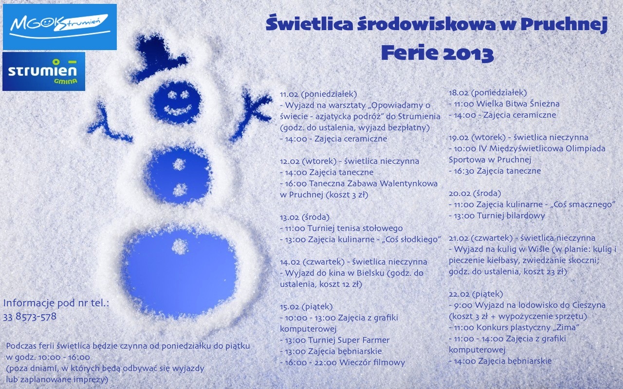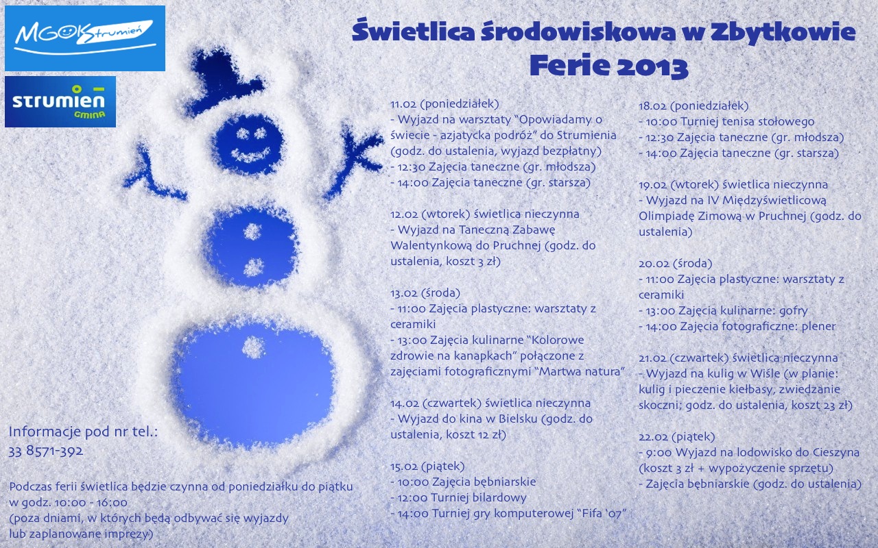 Ferie zimowe w województwie śląskim rozpoczynają sie 11 lutego 2013 i trwają do 22 lutego. W gminie Strumień realizowanych będzie wiele atrakcji. Szczegóły w załączniku.