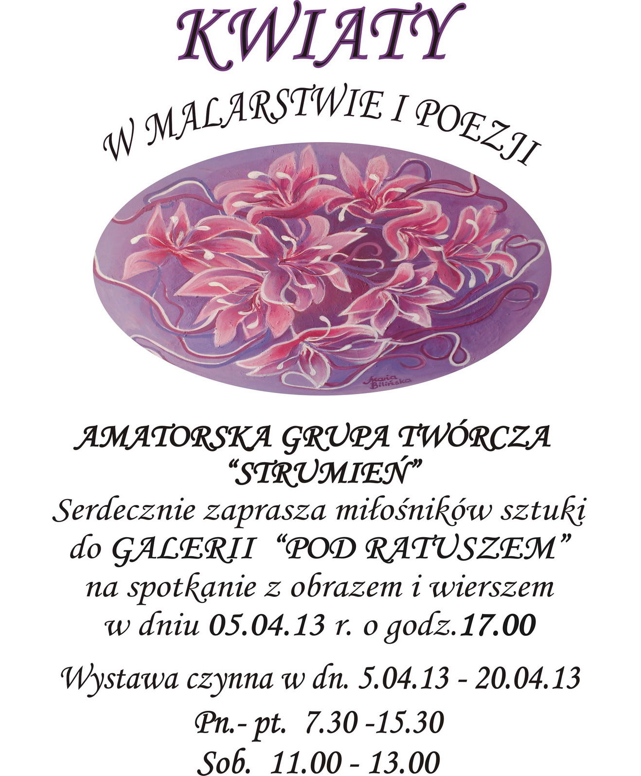 5 kwietnia o godz. 17:00 w Galerii pod Ratuszem odbędzie się wernisaż wystawy pt.: „Kwiaty w malarstwie i poezji” przygotowaną przez Amatorską Grupę Twórczą „STRUMIEŃ” . Tego dnia oprócz podziwiania dzieł malarzy, będzie można posłuchać wierszy, którymi autorami są również członkowie AGT „STRUMIEŃ”. Wystawa trwać będzie do 20 kwietnia. Wstęp wolny. Serdecznie zapraszamy.