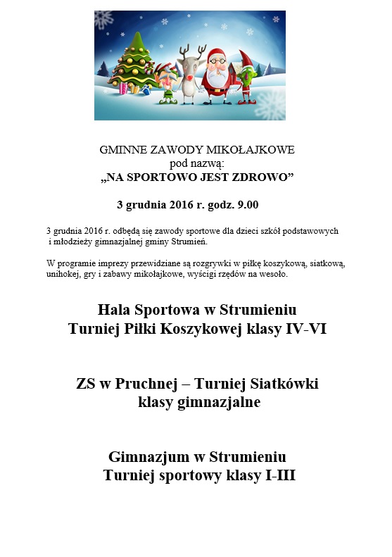 W programie imprezy przewidziane są rozgrywki w piłkę koszykową, siatkową, unihokej, gry i zabawy mikołajkowe, wyścigi rzędów na wesoło.