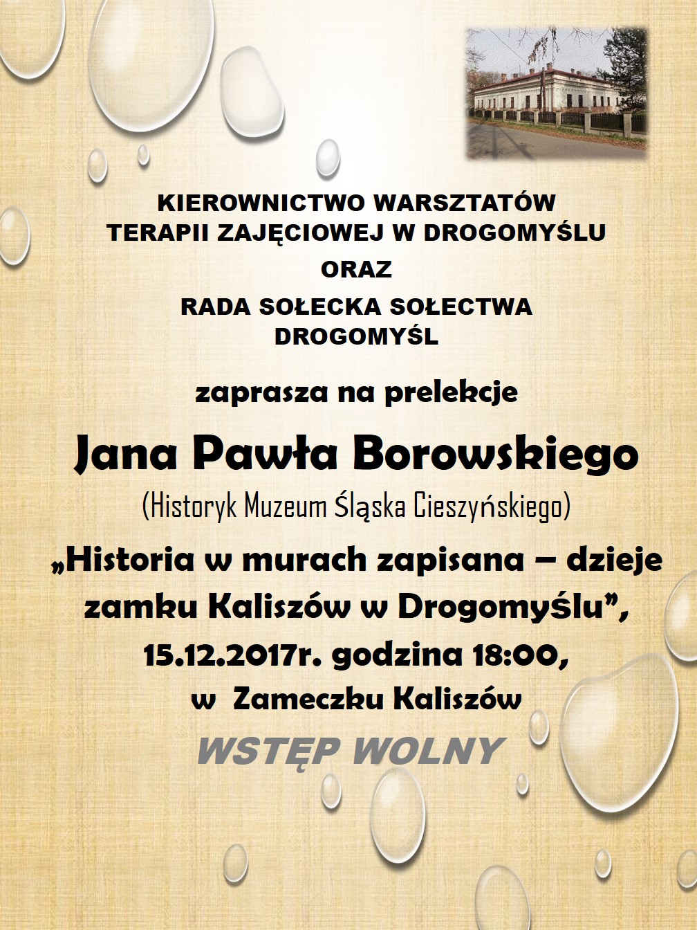 Kierownictwo warsztatów terapii zajęciowej w Drogomyślu oraz Rada Sołecka Drogomyśl zaprasza na prelekcję pt. „Historia w murach zapisana – dzieje zamku Kaliszów w Drogomyślu”, którą przedstawi historyk Muzeum Śląska Cieszyńskiego Jan Paweł Borowski.
