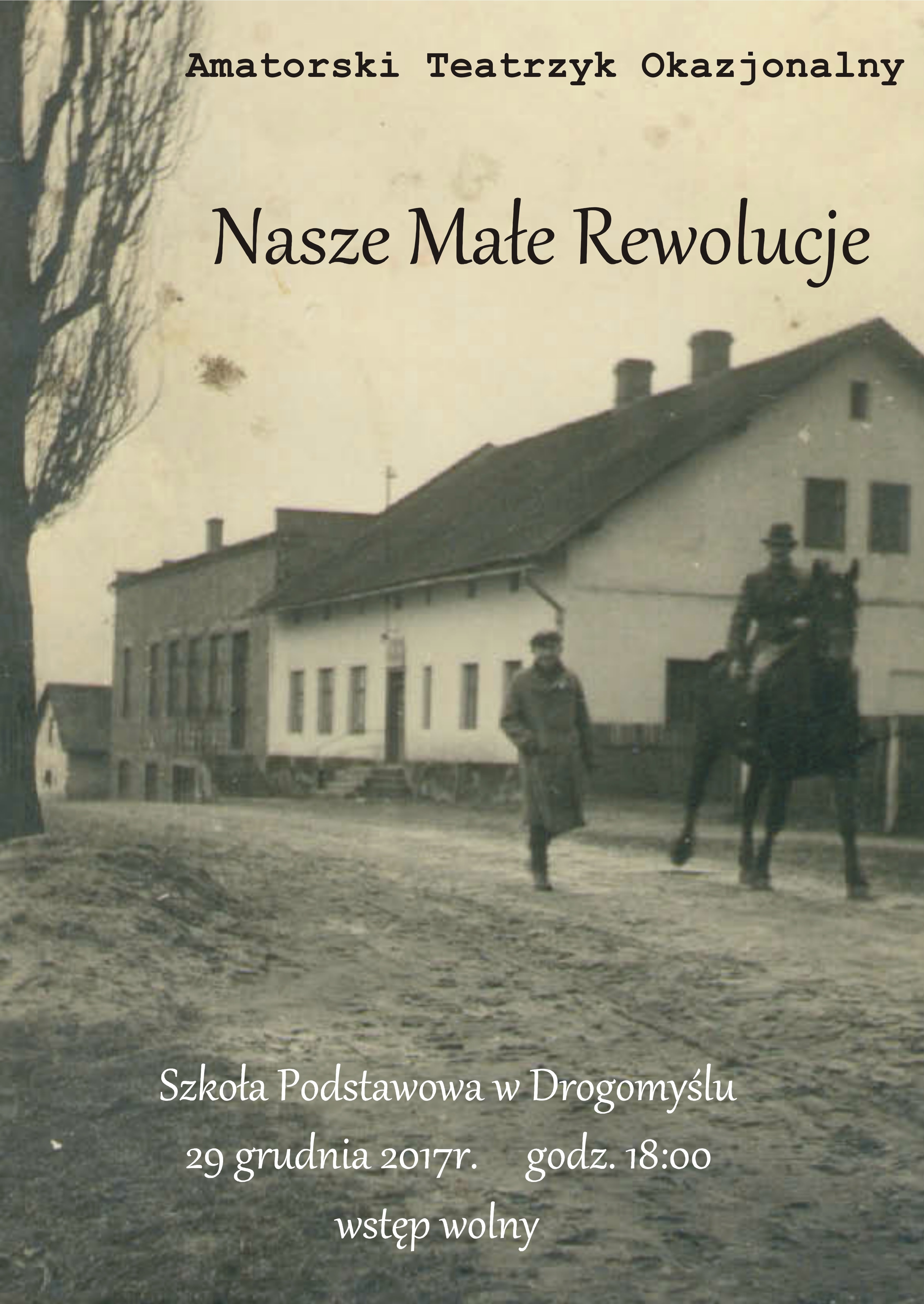 Zapraszamy do zobaczenia występu pt. „Nasze Małe Rewolucje”, który zaprezentuje Amatorski Teatrzyk Okazjonalny. Przedstawienie odbędzie się 29 grudnia o godzinie 18.00 w Szkole podstawowej w Drogomyślu. Wstęp wolny.