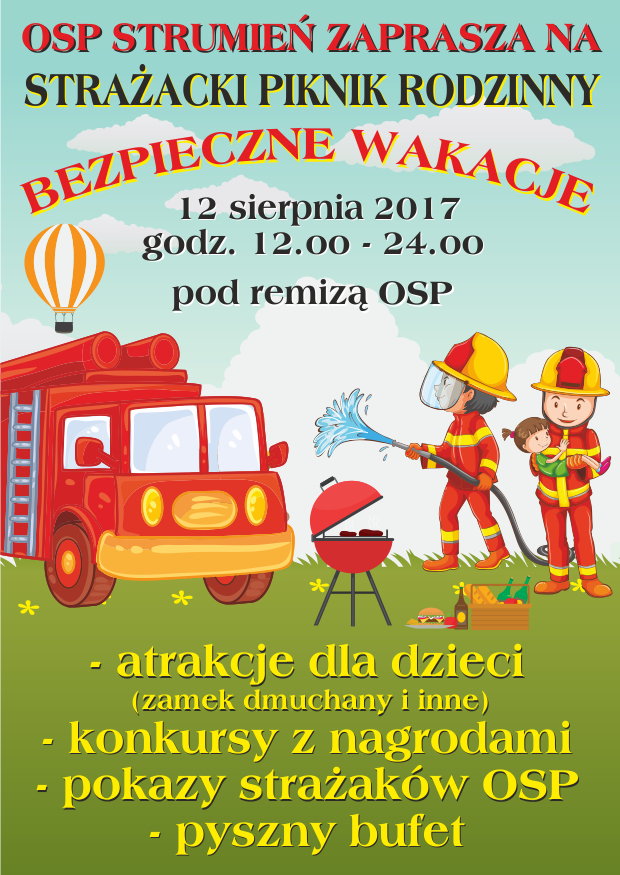 Serdecznie zapraszamy na Strażacki Piknik Rodzinny pt. Bezpieczne Wakacje, który odbędzie się 12 sierpnia od godziny 12.00 przy remizie Ochotniczej Straży Pożarnej w Strumieniu.