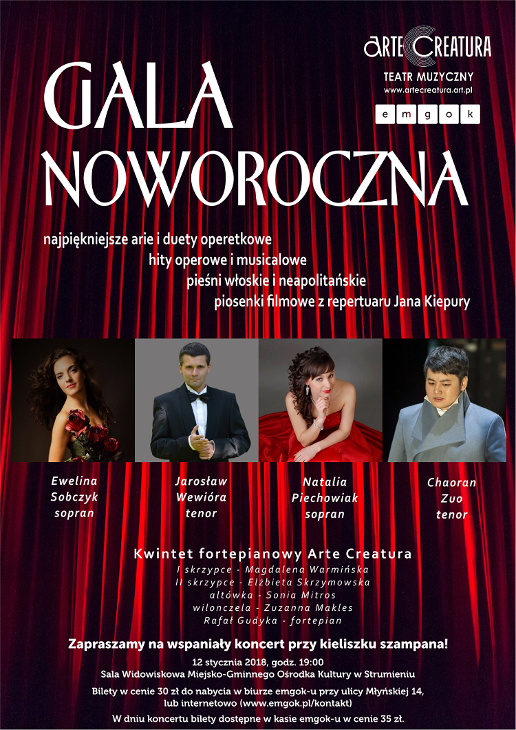 12 stycznia w Miejsko-Gminnym Ośrodku Kultury w Strumieniu odbędzie się Noworoczna Gala Operetkowa. W programie znajdą się najsłynniejsze arie, duety i sceny z operetek, kilka hitów operowych - "La donna e mobile", czy słynne "Libiamo" z opery "Traviata". Na wzór trzech tenorów, pojawi się wiązanka słynnych pieśni włoskich i neapolitańskich w wykonaniu Jarosława Wewióry i Chaorana Zuo z Chin. Nie obejdzie się bez arii i piosenek z musicali w wykonaniu solistek Natalii Piechowiak i Eweliny Sobczyk, oraz pieśni i piosenek filmowych z repertuaru Jana Kiepury.