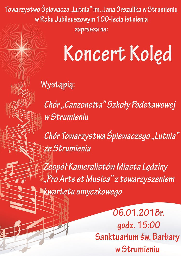 Towarzystwo Śpiewacze „Lutnia” im. Jana Orszulika w Strumieniu w Roku Jubileuszowym 100-lecia istnienia zaprasza na Koncert Kolęd, który odbędzie się 6 stycznia o godzinie 15.00 w Sanktuarium św. Barbary w Strumieniu.