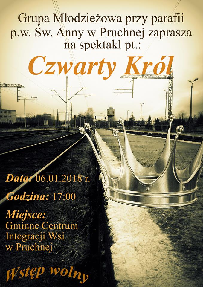 Grupa Młodzieżowa przy parafii p. w. Św. Anny w Pruchnej zaprasza na spektakl „Czwarty Król”, który odbędzie się 6 stycznia o godzinie 17.00 w Gminnym Centrum Integracji Wsi w Pruchnej. Wstęp wolny.