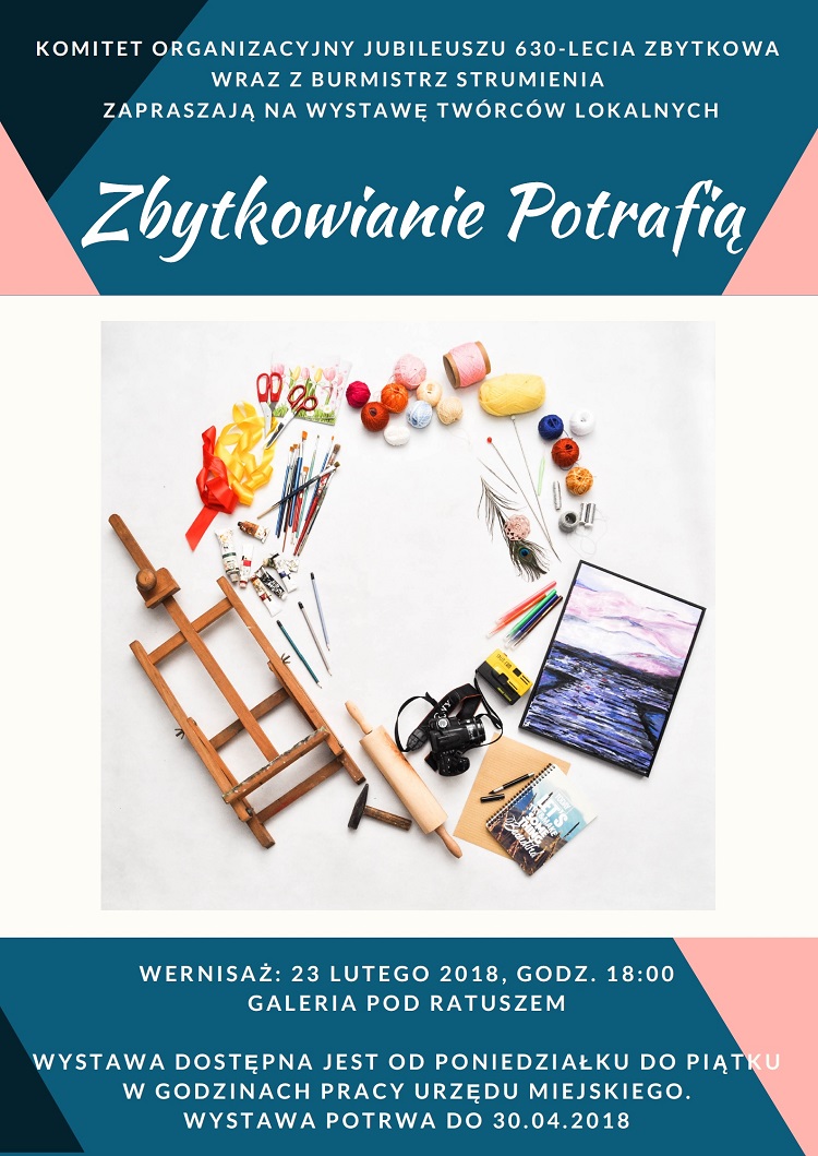 Komitet organizacyjny Jubileuszu 630-lecia Zbytkowa wraz z Burmistrza Strumienia zapraszają na wernisaż wystawy twórców lokalnych pt. "Zbytkowianie Potrafią", który odbędzie się 23 lutego o godzinie 18.00 w Galerii pod Ratuszem, Rynek 4. Wystawę można oglądać do 30.04.2018 r. od poniedziałku do piątku w godzinach pracy Urzędu Miejskiego w Strumieniu. Dla grup zorganizowanych termin prosimy ustalać telefonicznie 781 727 772.