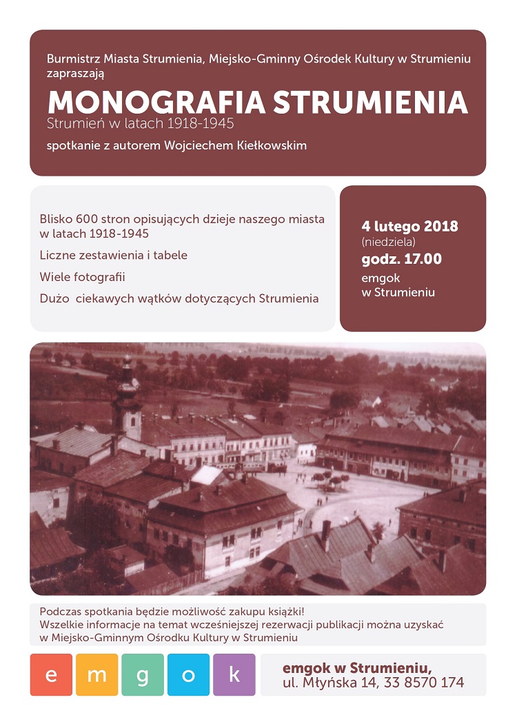 Zapraszamy na spotkanie promocyjne monografii "Strumień w latach 1918-1945", które odbędzie się 4 lutego o godzinie 17.00 w Miejsko-Gminnym Ośrodku Kultury w Strumieniu przy ul. Młyńskiej 14. Obszerną monografię miasta Strumienia autorstwa Wojciecha Kiełkowskiego można kupić w biurze Miejsko-Gminnego Ośrodka Kultury w cenie 80 zł. Ilość egzemplarzy ograniczona.