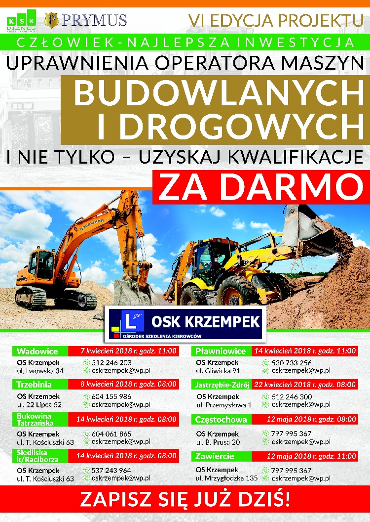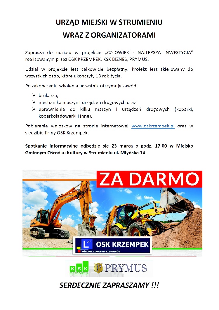 Urząd Miejski w Strumieniu wraz z Organizatorami zapraszają do udziału w projekcie „CZŁOWIEK - NAJLEPSZA INWESTYCJA” realizowanym przez OSK KRZEMPEK, KSK BIZNES, PRYMUS.