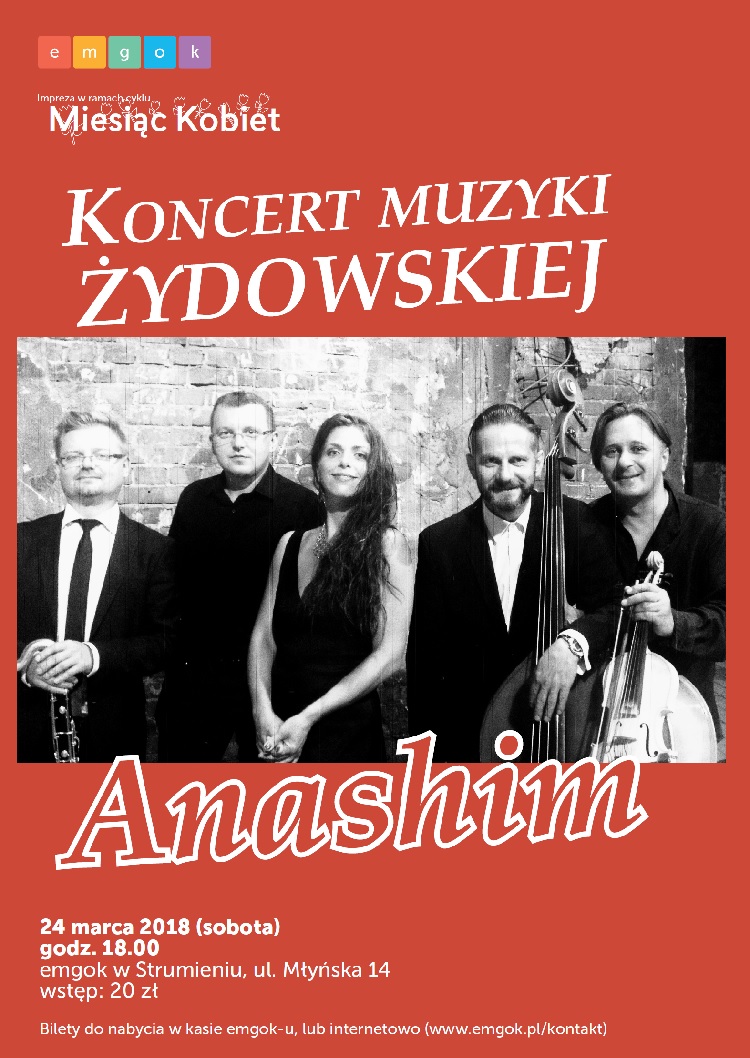W ramach cyklu Miesiąca Kobiet w Miejsko- Gminnym Ośrodku Kultury w Strumieniu odbędzie się Koncert Muzyki Żydowskiej w wykonaniu zespołu Anashim. Koncert odbędzie się 24 marca o godzinie 18.00 w emgoku przy ulicy Młyńskiej 14 w Strumieniu. Wstęp 20 zł.