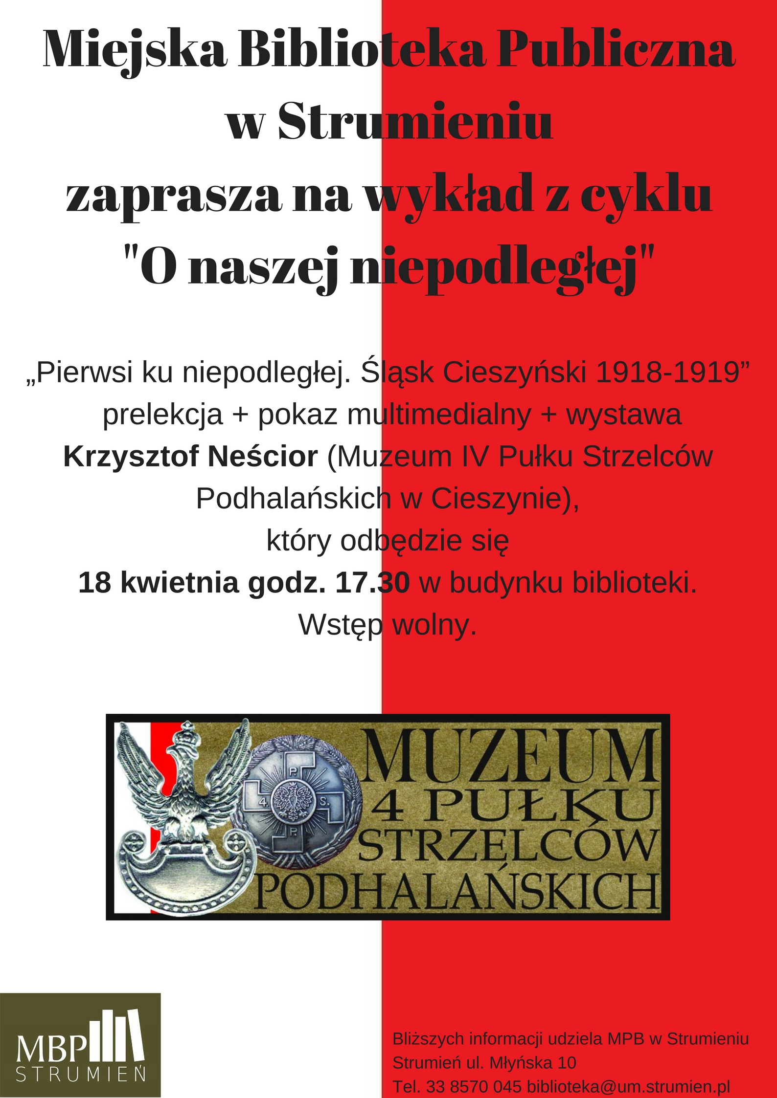 Pierwsi ku niepodległej. Śląsk Cieszyński 1918-1919” prelekcję + pokaz multimedialny + wystawę poprowadzi Krzysztof Neścior (Muzeum IV Pułku Strzelców Podhalańskich w Cieszynie) o godzinie 17.30