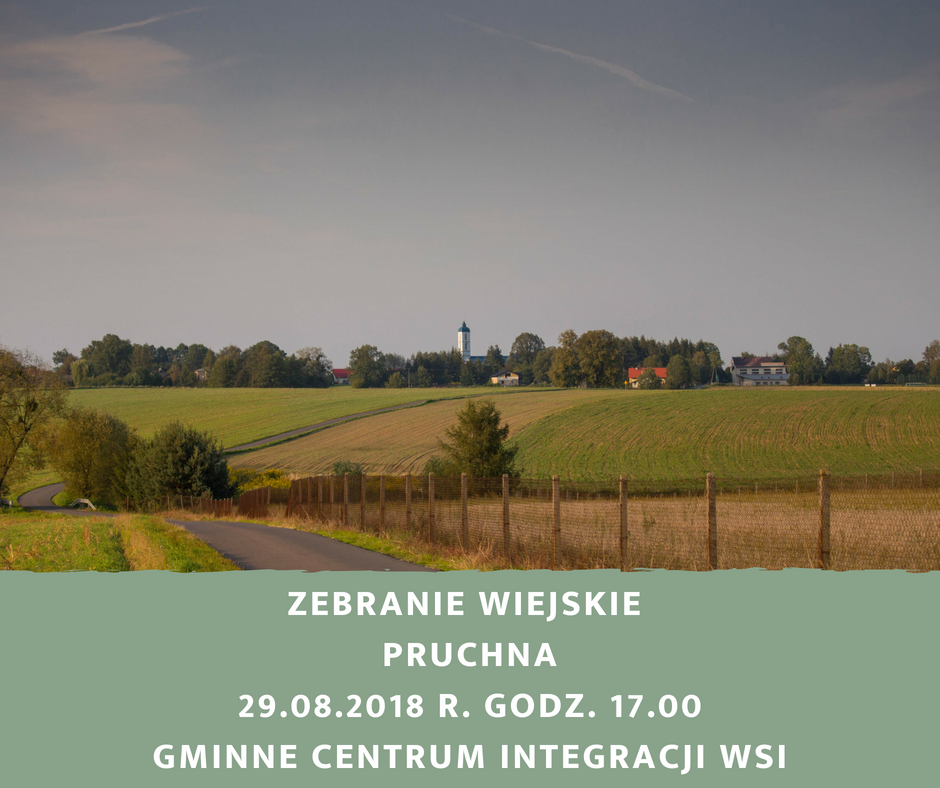 Sołtys sołectwa Pruchna informuje, że 29 sierpnia 2018 r. o godz. 1700 w Gminnym Centrum Integracji Wsi w Pruchnej, ul. Główna 53 – odbędzie się Zebranie Wiejskie mieszkańców sołectwa Pruchna w celu wskazania przedsięwzięć do realizacji w 2019 roku w ramach funduszu sołeckiego.