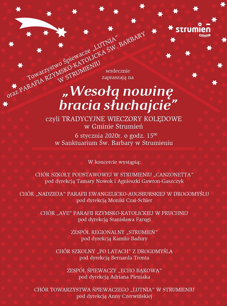 Towarzystwo Śpiewacze „Lutnia”  oraz Parafia Rzymsko- Katolicka Św. Barbary w Strumieniu serdecznie zapraszają na tradycyjne wieczory kolędowe w gminie Strumień „WESOŁĄ NOWINĘ BRACIA SŁUCHAJCIE”.