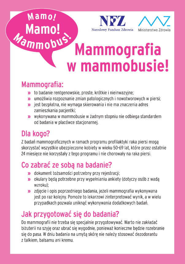 Mammografia jest bezpłatna, nie wymaga skierowania i wykonywana jest niezależnie od miejsca zamieszkania pacjentki.