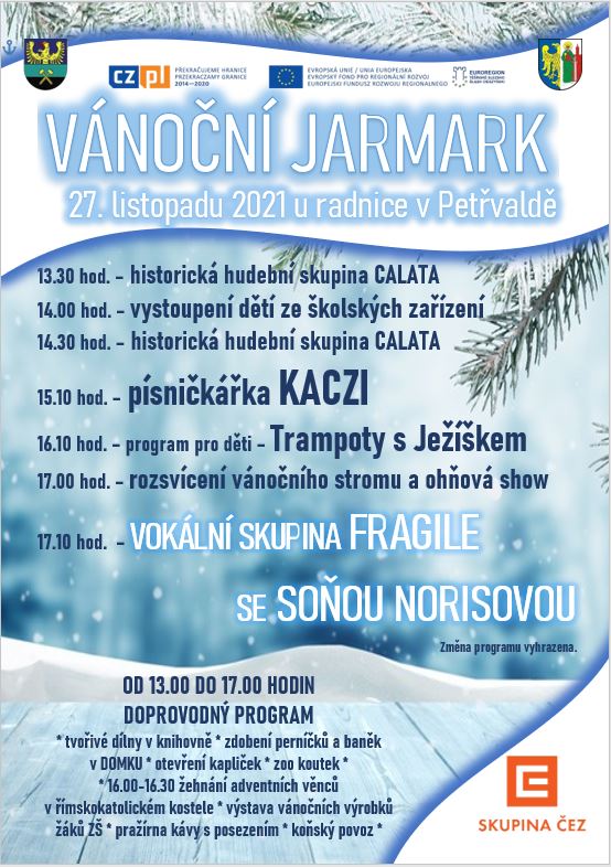 Miasto Petřvald z Czech partner Gminy Strumień serdecznie zaprasza do wzięcia udziału w Świątecznym Jarmarku, który odbędzie się 27.11.2021 r. w godzinach: 13:30-17:00.