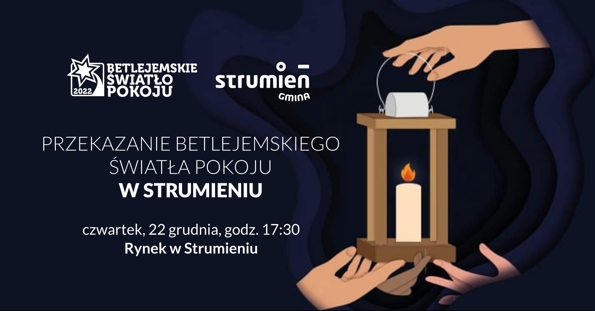 Uroczyste przekazanie światła mieszkańcom gminy Strumień odbędzie się w czwartek 22 grudnia o godzinie 17:30 na strumieńskim rynku przed budynkiem ratusza. Zapraszamy do udziału w wydarzeniu i zabrania światła do swoich domów. Zapraszamy z własnymi lampionami.