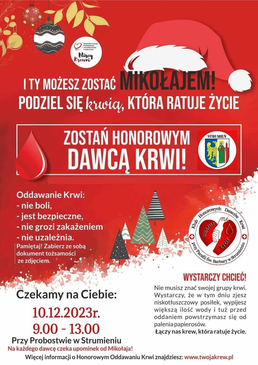 Wspólnie z Klub Honorowych Dawców Krwi przy Parafii Świętej Barbary w Strumieniu serdecznie zachęcamy do udziału w mikołajkowej edycji akcji krwiodawstwa! Każdy z nas może zostać Świętym Mikołajem.