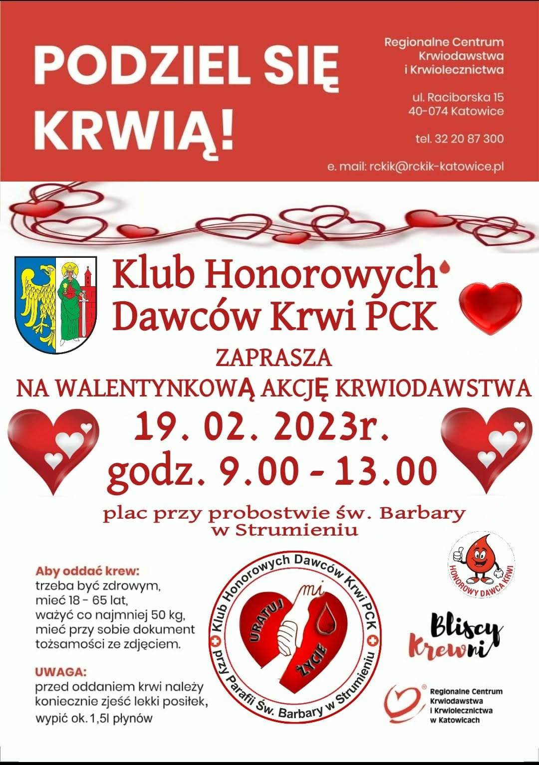 Klub Honorowych Dawców Krwi PCK oraz Gmina Strumień zapraszają na walentynkową akcję krwiodawstwa, która odbędzie się 19.02.2023 r. godz. 9:00-13:00, na placu przy probostwie św. Barbary w Strumieniu.