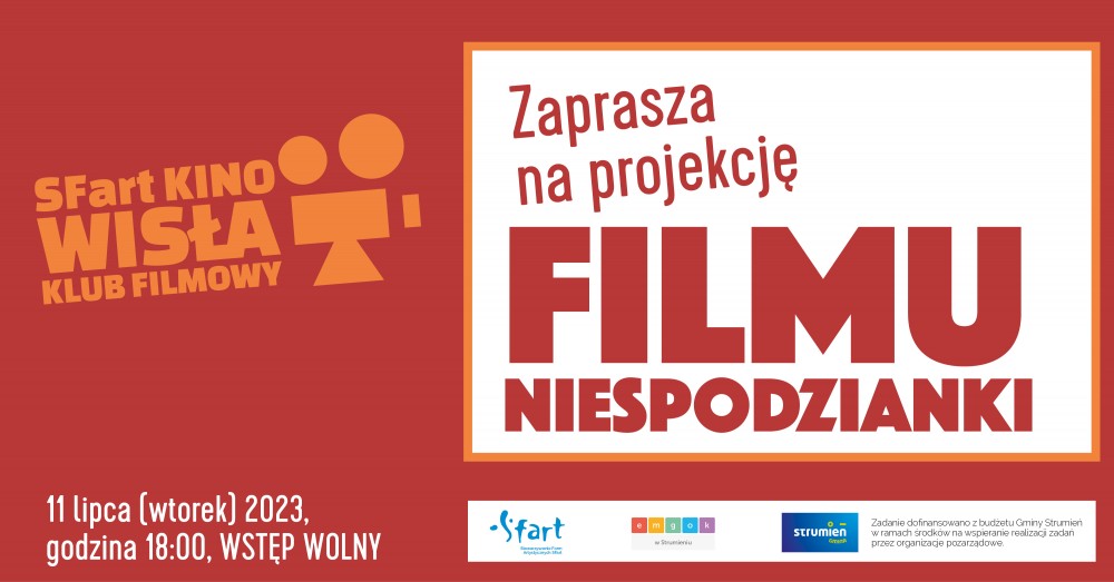 Stowarzyszenie Form Artystycznych SFart i Miejsko-Gminny Ośrodek Kultury w Strumieniu zapraszają na projekcję FILMU NIESPODZIANKI, która odbędzie się w ramach działalności Klubu Filmowego SFart Kino Wisła w sali widowiskowej strumieńskiego emgoku we wtorek 11 lipca 2023 r. o godzinie 18:00. Pokaz filmu poprzedzony będzie wprowadzeniem naszego Gościa i zakończony dyskusją.