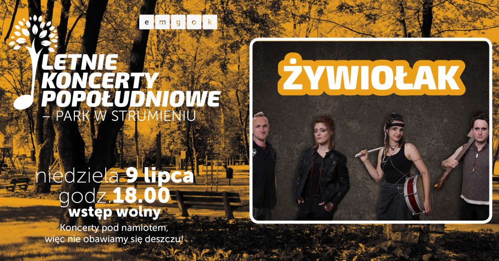 Miejsko-Gminny Ośrodek Kultury w Strumieniu zaprasza do udziału w Letnich Koncertach Popołudniowych, które w okresie wakacji będą się odbywały na scenie plenerowej w Parku Miejskim w Strumieniu! W niedzielę 9 lipca wystąpi dla nas grupa ŻYWIOŁAK, tworząca eksperymentalną, żywiołową muzykę w stylu folk opartą na cytatach ludowych, wątkach mitologicznych i historycznych wykonywana na tradycyjnych i rzadkich instrumentach. Żywiołak gościł już na wielu dużych scenach między innymi na festiwalu Opener i Przystanku Woodstock, a teraz zagra dla nas w strumieńskim parku!