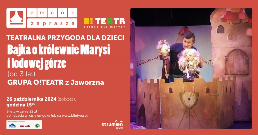 Miejsko-Gminny Ośrodek Kultury w Strumieniu (emgok) zaprasza na kolejną odsłonę teatralnej przygody dla dzieci! W sobotę 26 października o godzinie 15:00 w sali widowiskowej strumieńskiego emgoku (ul. Młyńska 14) odbędzie się spektakl „Bajka o królewnie Marysi i lodowej górze” w wykonaniu Grupy O!Teatr z Jaworzna. Bilety w cenie 22 zł do nabycia w kasie emgoku lub online w serwisie biletyna.pl.