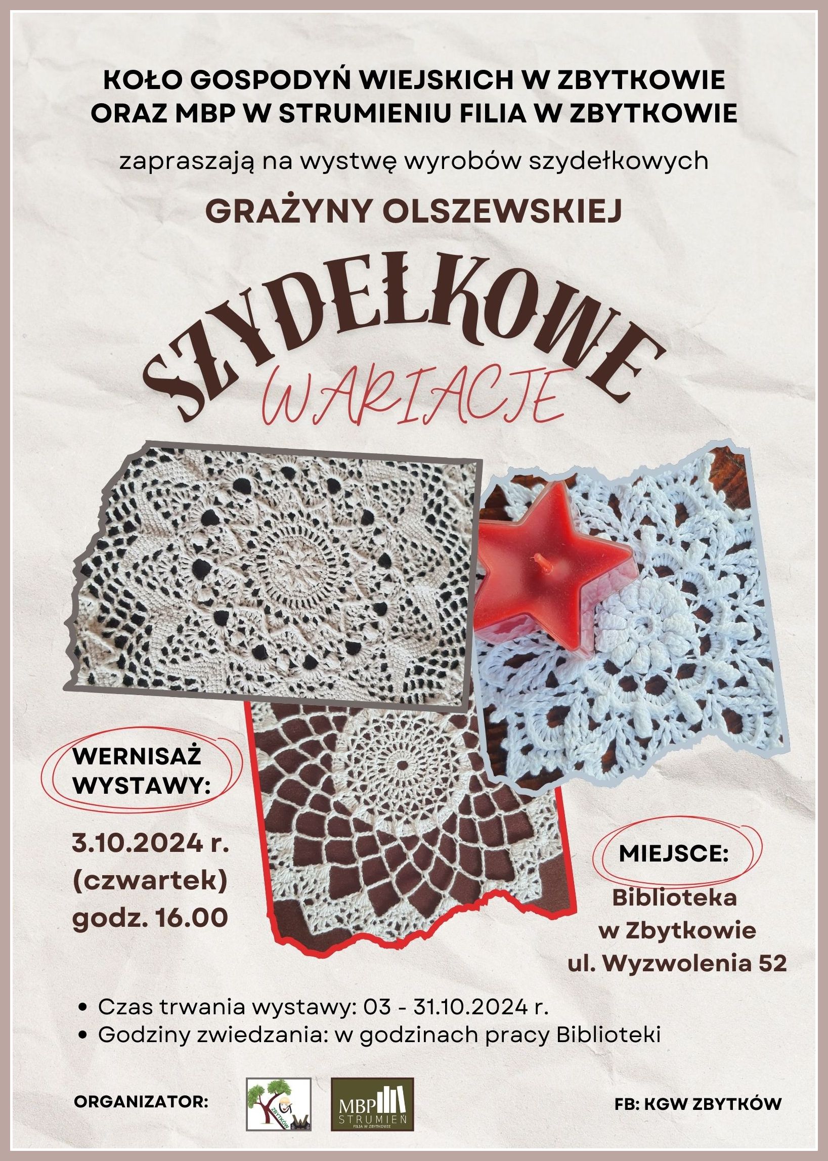 KGW w Zbytkowie oraz Miejska Biblioteka Publiczna w Strumieniu filia w Zbytkowie serdecznie zapraszają na wystawę wyrobów szydełkowych Grażyny Olszewskiej "Szydełkowe wariacje"