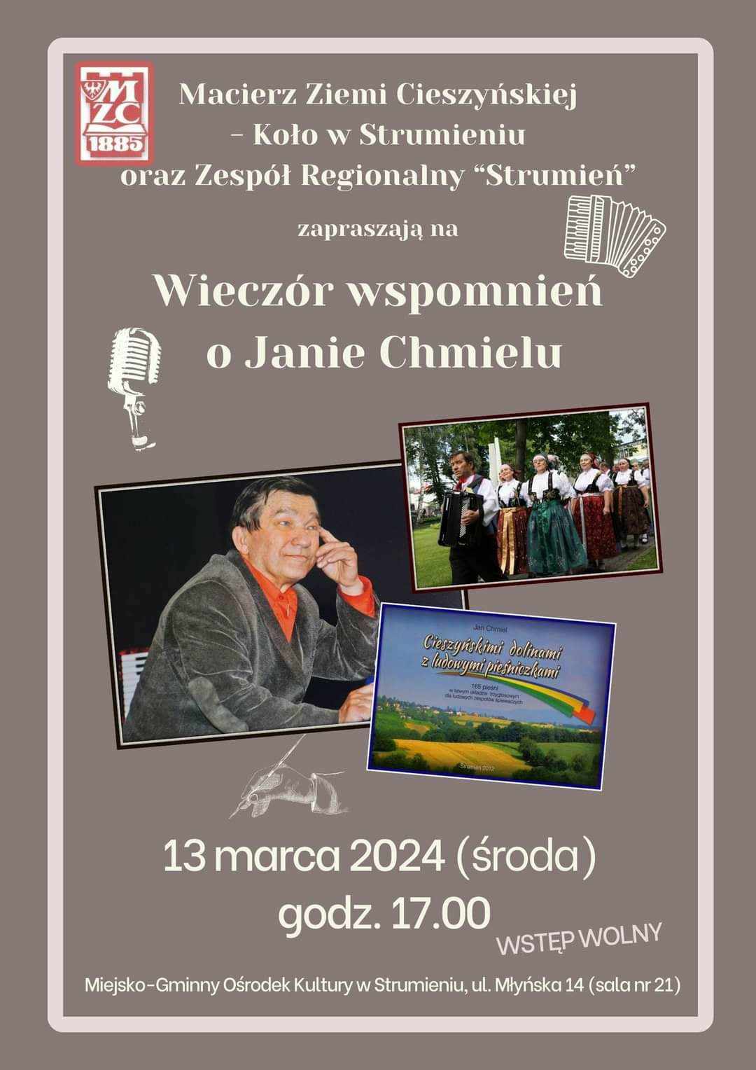 Macierz Ziemi Cieszyńskiej - Koło w Strumieniu oraz Zespół Regionalny "Strumień" zapraszają na Wieczór wspomnień o Janie Chmielu.
