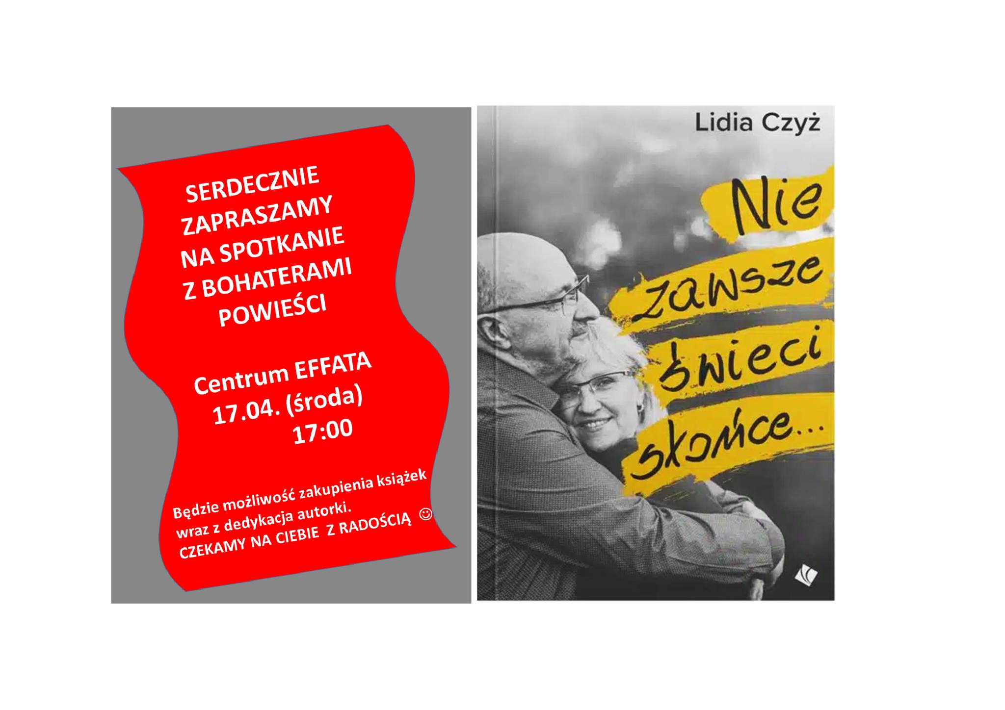 17 kwietnia o godzinie 17:00 w Centrum Parafialnym Effata w Drogomyślu odbędzie się spotkanie autorskie z Lidią Czyż, w związku z promocją książki "Nie zawsze świeci słońce".  Zapraszamy w imieniu Parafii Ewangelicko - Augsburskiej w Drogomyślu.