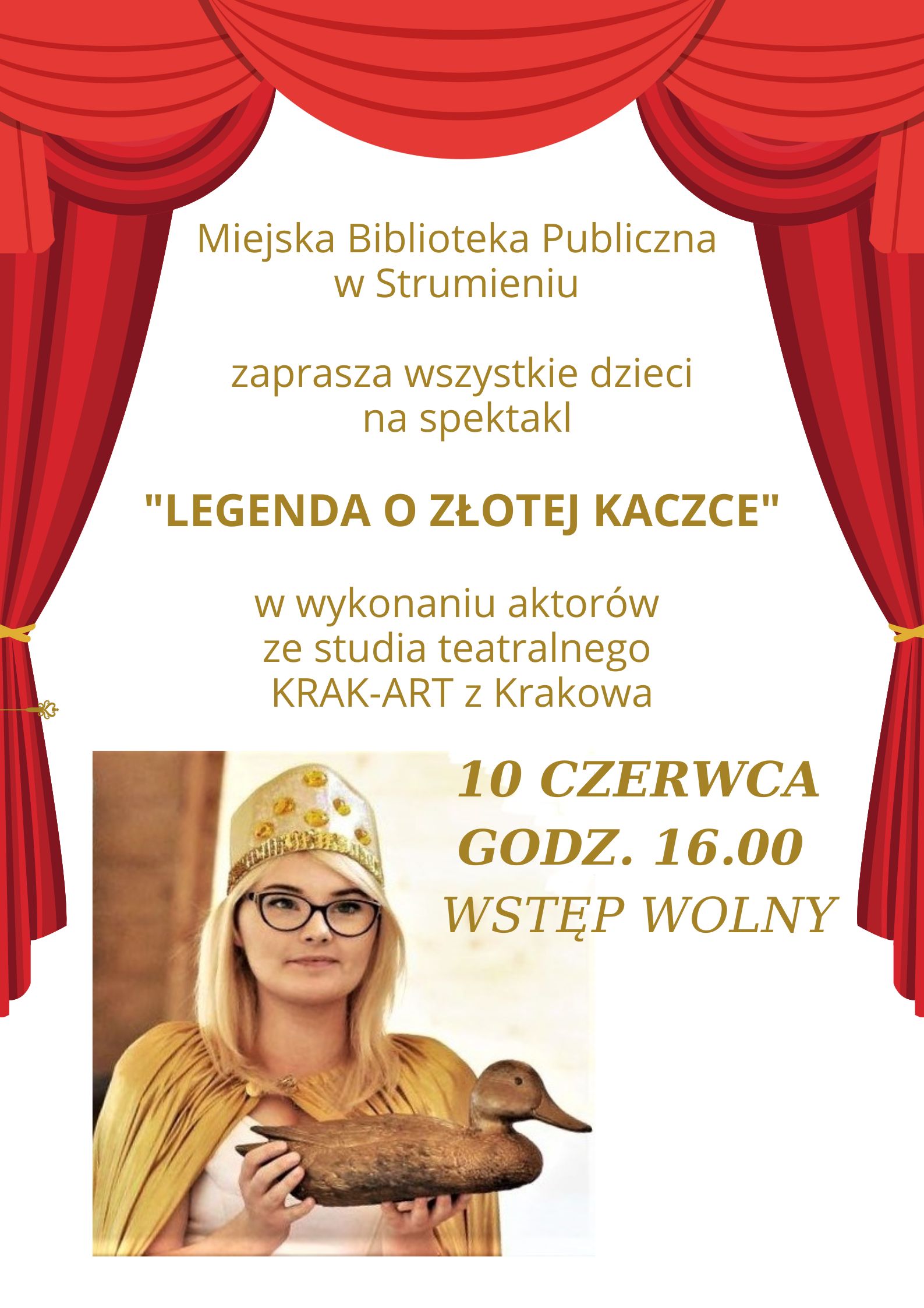 Miejska Biblioteka Publiczna w Strumieniu zaprasza wszystkie dzieci na spektakl "LEGENDA O ZŁOTEJ KACZCE"