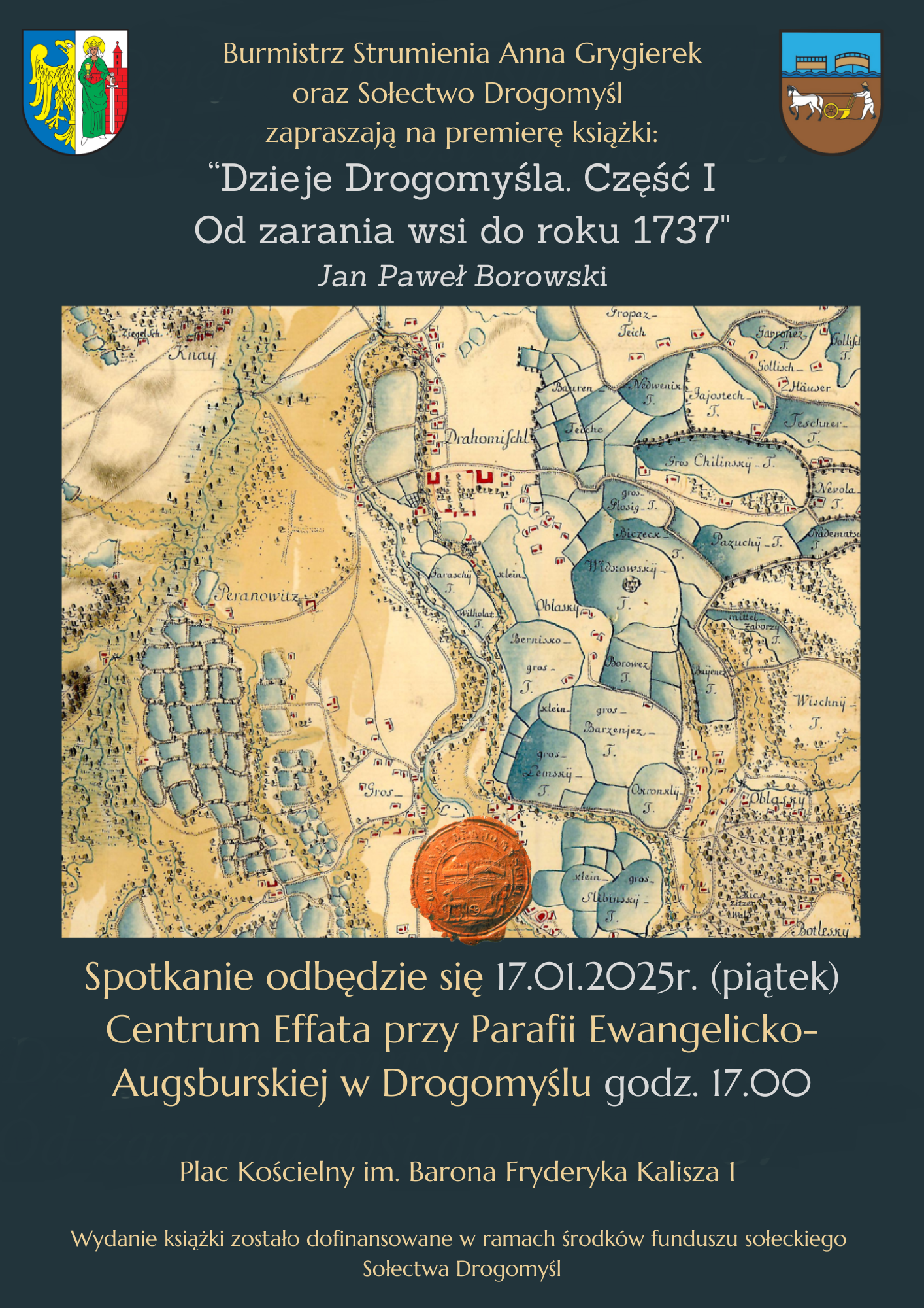 Burmistrz Strumienia, Anna Grygierek, oraz Sołectwo Drogomyśl serdecznie zapraszają na wyjątkowe wydarzenie – premierę książki „Dzieje Drogomyśla. Część I. Od zarania wsi do roku 1737”.