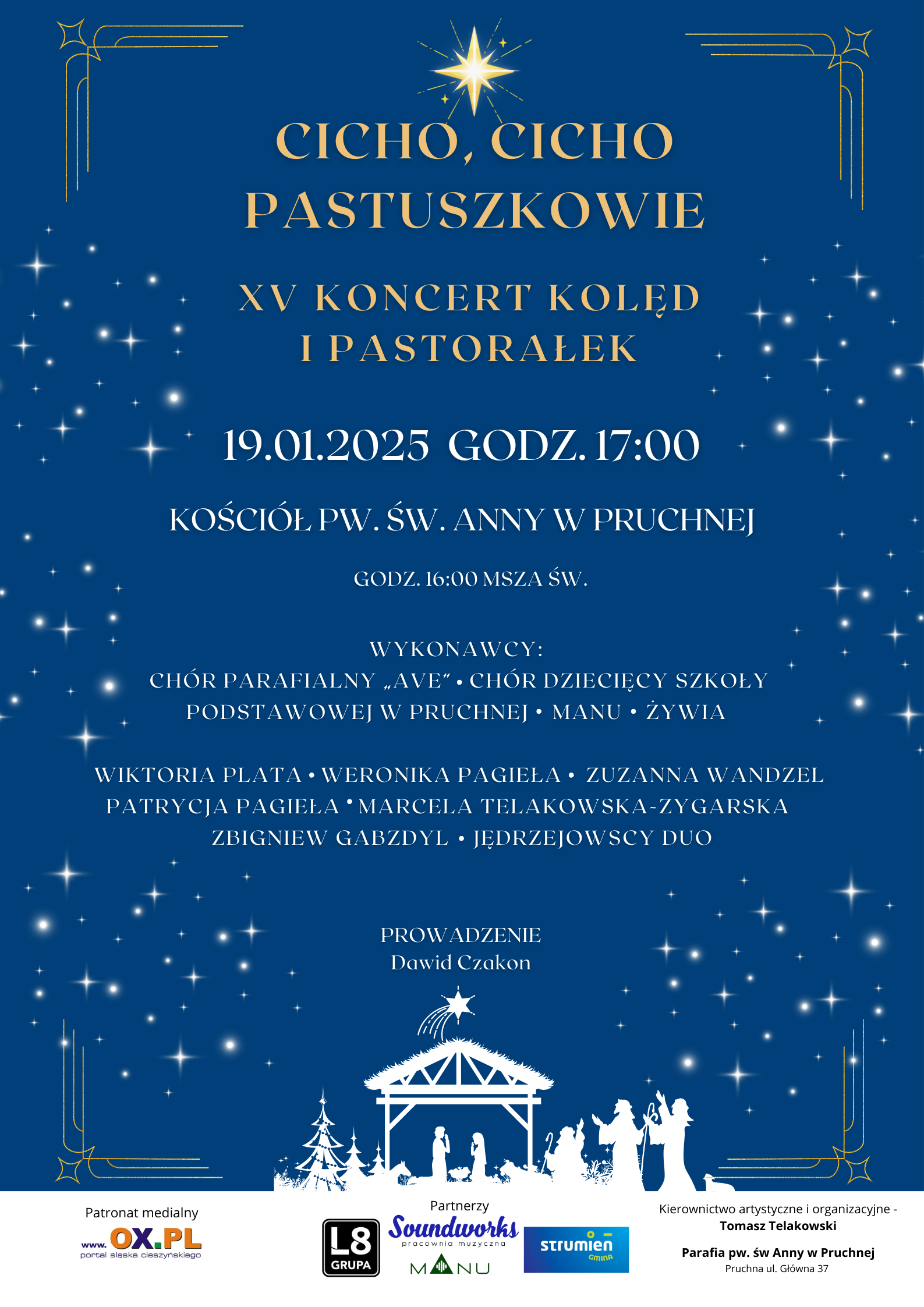 Serdecznie zapraszamy na jubileuszowy XV Koncert Kolęd i Pastorałek „Cicho, cicho pastuszkowie”, który odbędzie się 19 stycznia 2025 roku o godz. 17:00 w kościele pw. św. Anny w Pruchnej.