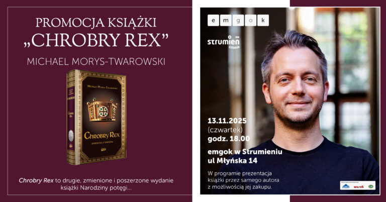 Miejsko-Gminny Ośrodek Kultury w Strumieniu (emgok) zaprasza na spotkanie autorskie z Michaelem Morysem-Twarowskim, organizowane w związku z promocją książki „Chrobry Rex”. Wydarzenie odbędzie się w czwartek 13 listopada 2025 r. o godzinie 18:00 w strumieńskim emgoku.