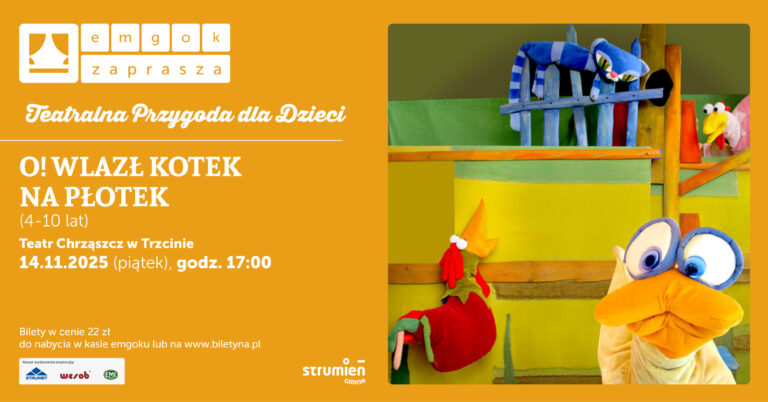 Miejsko-Gminny Ośrodek Kultury w Strumieniu (emgok) zaprasza na kolejną odsłonę teatralnej przygody dla dzieci! W piątek 14 listopada o godzinie 17:00 w przedstawieniu „O! Wlazł kotek na płotek” dla młodych widzów od 5 do 10 lat, wystąpi dla nas Teatr Chrząszcz w Trzcinie.