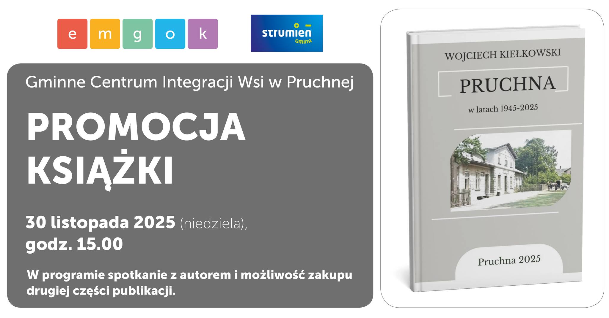 Miejsko-Gminny Ośrodek Kultury w Strumieniu zaprasza na spotkanie autorskie z Wojciechem Kiełkowskim w związku z premierą wydawnictwa "Pruchna w latach 1945-2025". Wydarzenie odbędzie się w niedzielę 30 listopada 2025 o godzinie 15:00 w Centrum Integracji Wsi w Pruchnej, ul. Główna 53.