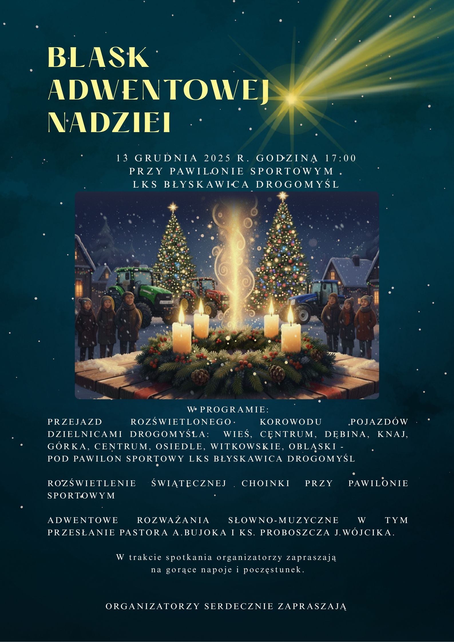 Przejazd rozświetlonego korowodu pojazdów dzielnicami Drogomyśla: Wieś, Centrum, Dębina, Knaj, Górka, Centrum, Osiedle, Witkowskie, Oblaski – pod Pawilon Sportowy LKS Błyskawica Drogomyśl.