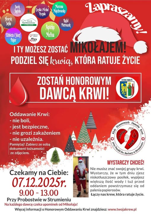 W imieniu Klub Honorowych Dawców Krwi przy Parafii Świętej Barbary w Strumieniu zapraszamy do udziału!  Krew będzie można oddać w najbliższą niedzielę, 7 grudnia, w godzinach 9:00-13:00 przy probostwie Sanktuarium pw. Świętej Barbary w Strumieniu.  Na każdego dawcę czeka drobny upominek od Mikołaja.