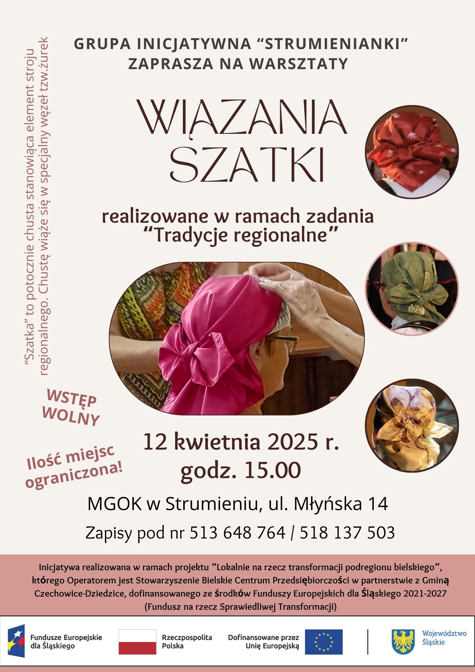 Grupa inicjatywna „Strumienianki” serdecznie zaprasza na wyjątkowe warsztaty „Wiązania szatki”, które odbędą się 12 kwietnia 2025 r. o godz. 15:00 w MGOK w Strumieniu (ul. Młyńska 14).
