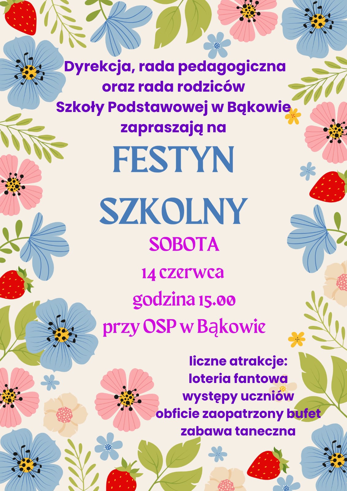 Dyrekcja, rada pedagogiczna oraz rada rodziców Szkoły Podstawowej w Bąkowie zapraszają na Festyn Szkolny