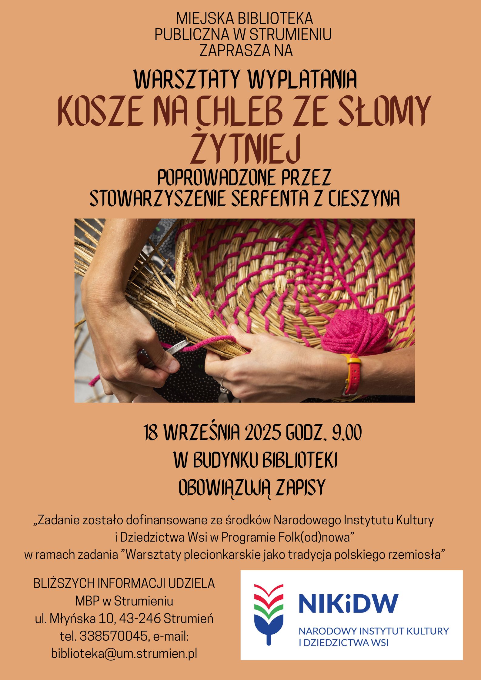 Miejska Biblioteka Publiczna w Strumieniu zaprasza na wyjątkowe warsztaty wyplatania koszy na chleb ze słomy żytniej, które poprowadzi Stowarzyszenie Serfenta z Cieszyna. Uczestnicy poznają tradycyjne techniki plecionkarskie, które od pokoleń są częścią polskiego rzemiosła.