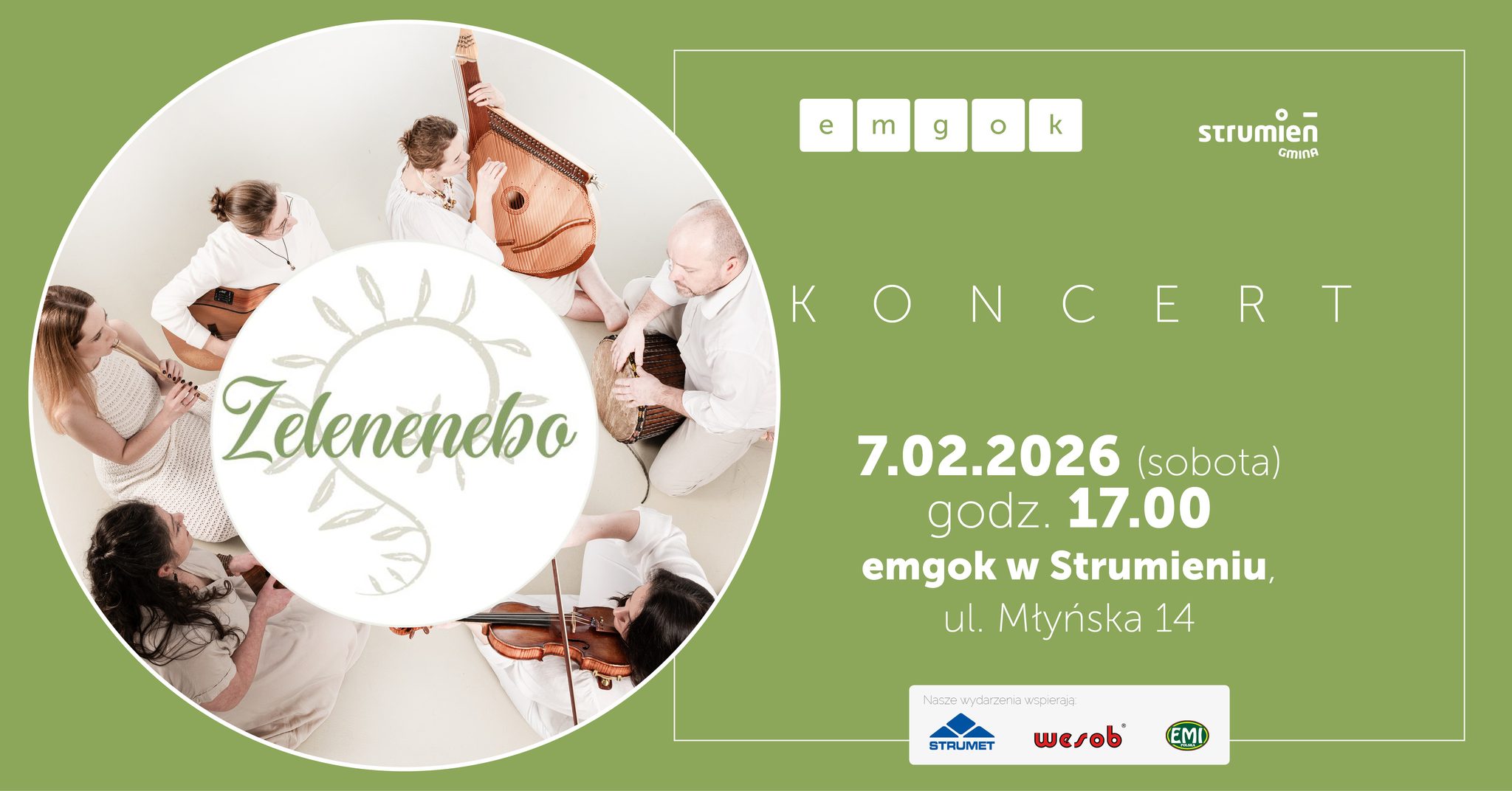 Miejsko-Gminny Ośrodek Kultury w Strumieniu (emgok) zaprasza na koncert ukraińsko-polskiego ZELENENEBO. To ukraińsko-polska grupa, tworząca muzykę na wielu klasycznych i ludowych instrumentach, zachwycająca dwu i trzygłosowym śpiewem. Całości dopełniają autorskie teksty inspirowane światem i człowiekiem. Wydarzenie odbędzie się w sobotę 7 lutego 2026 r. o godzinie 17:00 w sali widowiskowej Miejsko-Gminnego Ośrodka Kultury w Strumieniu.