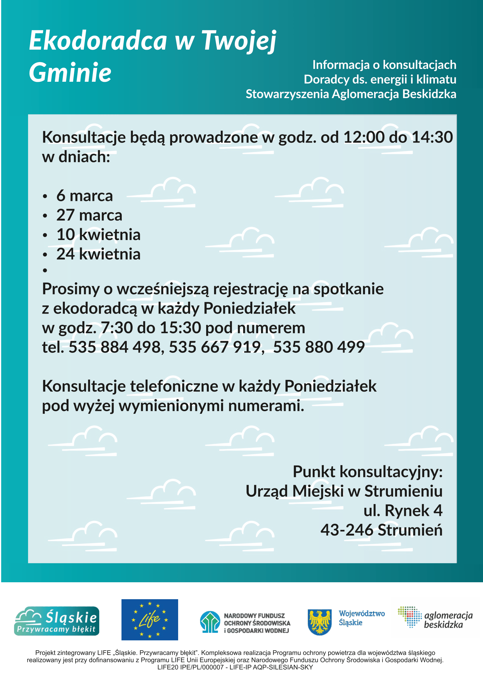 W ramach programu unijnego LIFE  „Śląskie. Przywracamy błękit.” Kompleksowa realizacja Programu ochrony powietrza dla województwa śląskiego,  w Urzędzie Miejskim w Strumieniu będzie pełnił dyżury Ekodoradca, który pomoże mieszkańcom gminy uzyskać pomoc w zakresie: