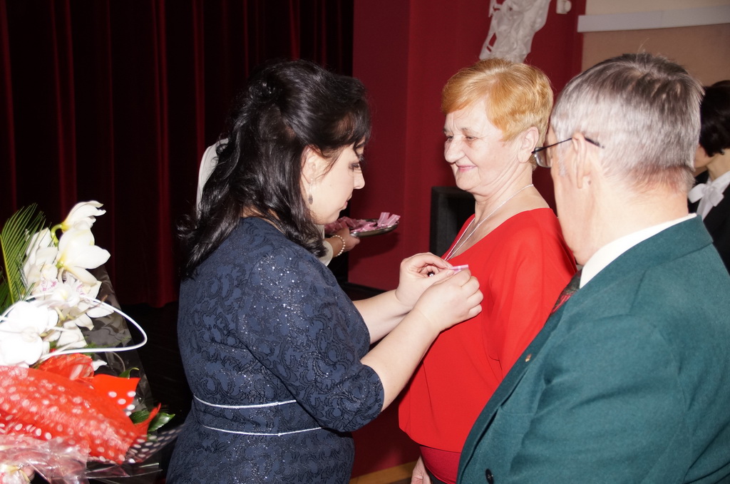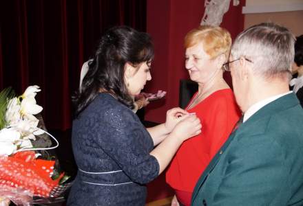 Anna Grygierek - Burmistrz Strumienia w imieniu Prezydenta RP wręczyła medale oraz drobne upominki, natomiast kwiaty solenizanci otrzymali z rąk Przewodniczącego Rady Miejskiej w Strumieniu Pana Czesława Grenia.