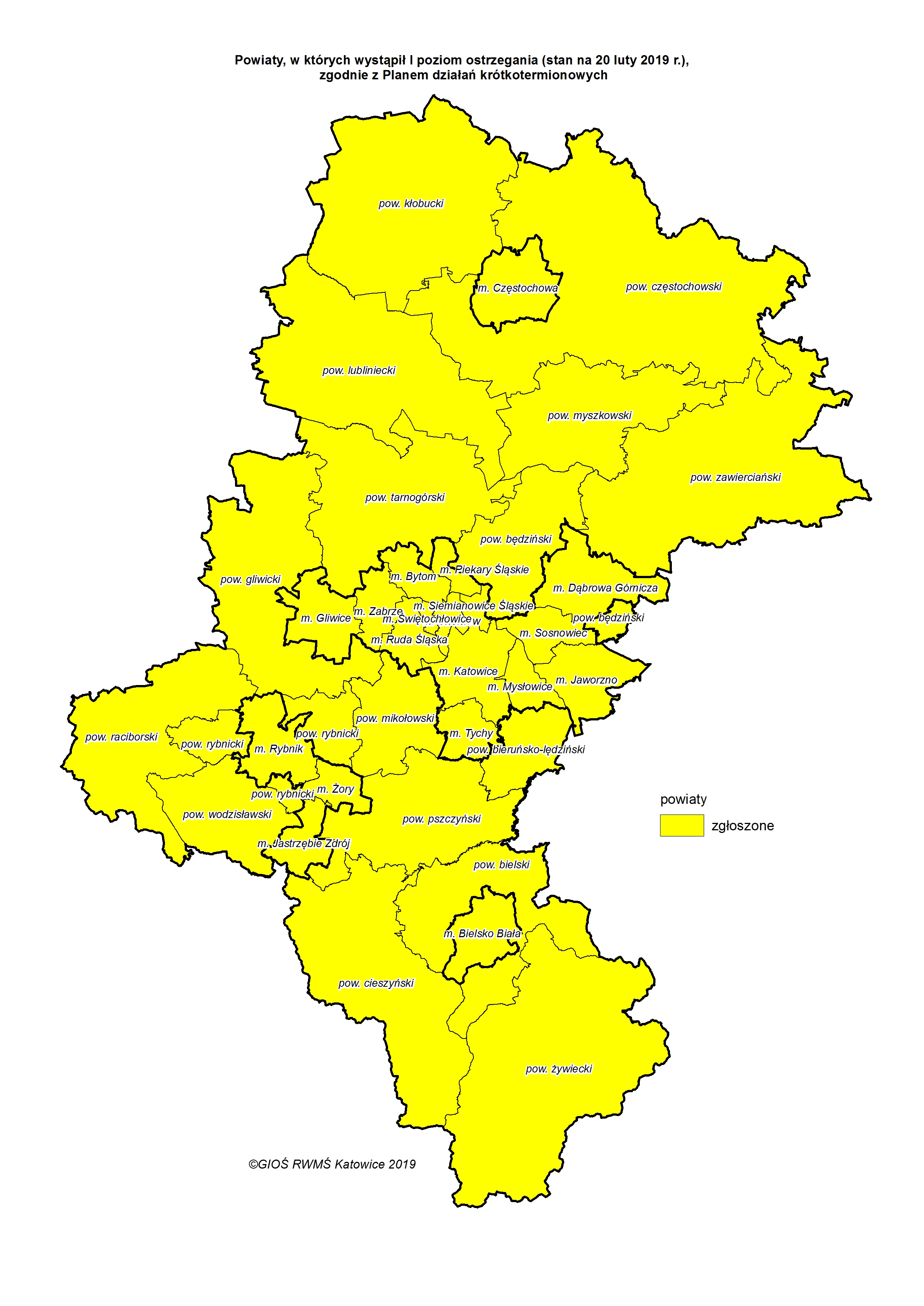 Zgodnie z otrzymanym w dniu 27.02.2020r. pismem Śląskiego Urzędu Wojewódzkiego w Katowicach, w ramach realizacji Planu działań krótkoterminowych (PDK), Burmistrz Strumienia przekazuje informację Regionalnego Wydziału Monitoringu Środowiska w Katowicach – Departament Monitoringu Środowiska o wystąpieniu na terenie województwa śląskiego I poziomu ostrzegania (poziom informacyjny i edukacyjny) - kolor żółty. Zgodnie z PDK, stanowiącym część „Programu ochrony powietrza dla terenu województwa śląskiego mającego na celu osiągnięcie poziomów dopuszczalnych substancji w powietrzu oraz pułapu stężenia ekspozycji” -przyjętego uchwałą Nr V/47/5/2017 Sejmiku Województwa Śląskiego z dnia 18 grudnia 2017 roku, wystąpienie I poziomu ostrzegania związane jest z przekroczeniem dozwolonej liczby 35 dni ze stężeniem powyżej wartości dobowej dopuszczalnej 50 µg/m3  pyłu zawieszonego PM10 ustalone wg kryterium liczby przekroczeń z ostatnich 12 miesięcy. Poziom I obowiązuje do końca 2020 roku.
